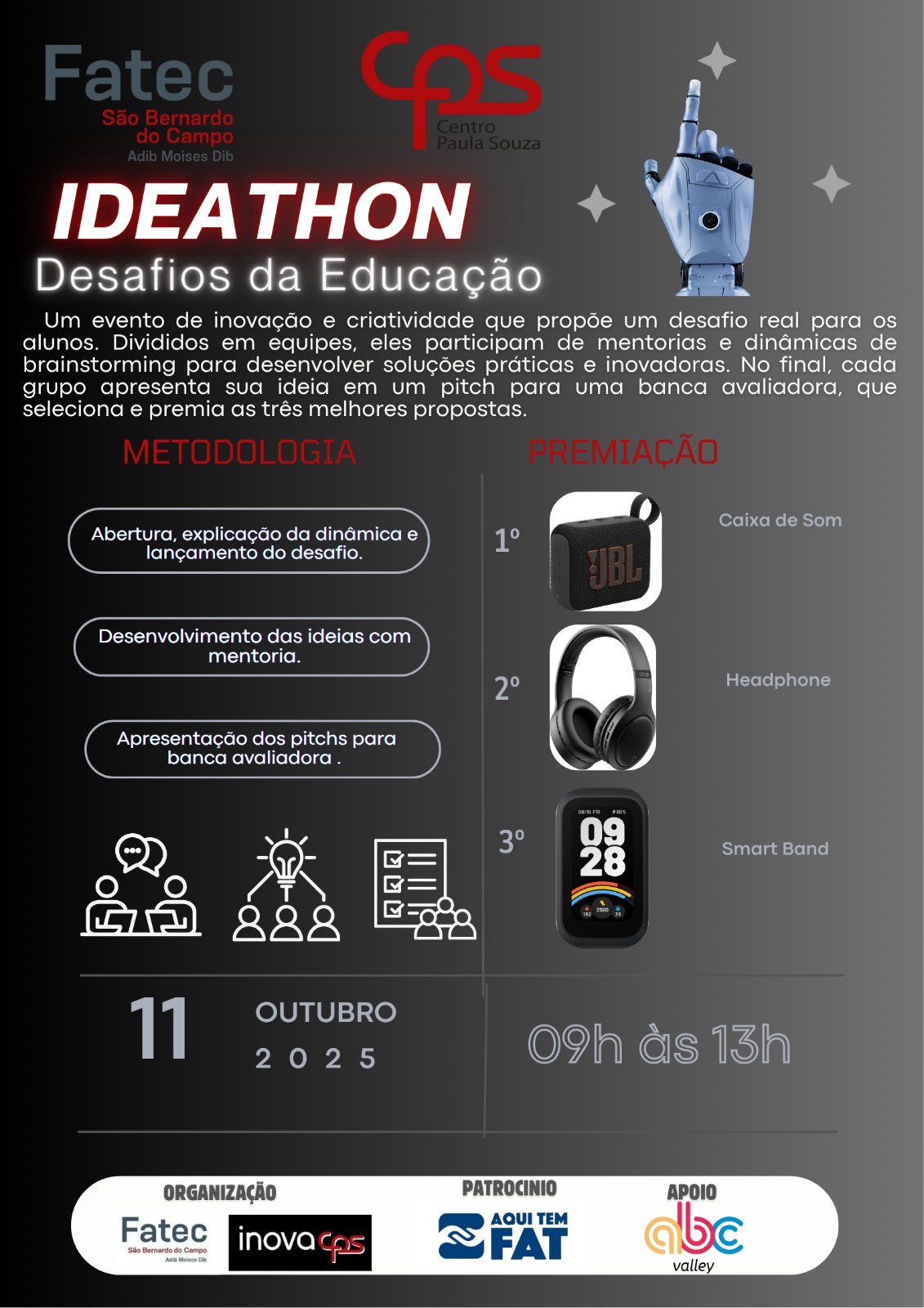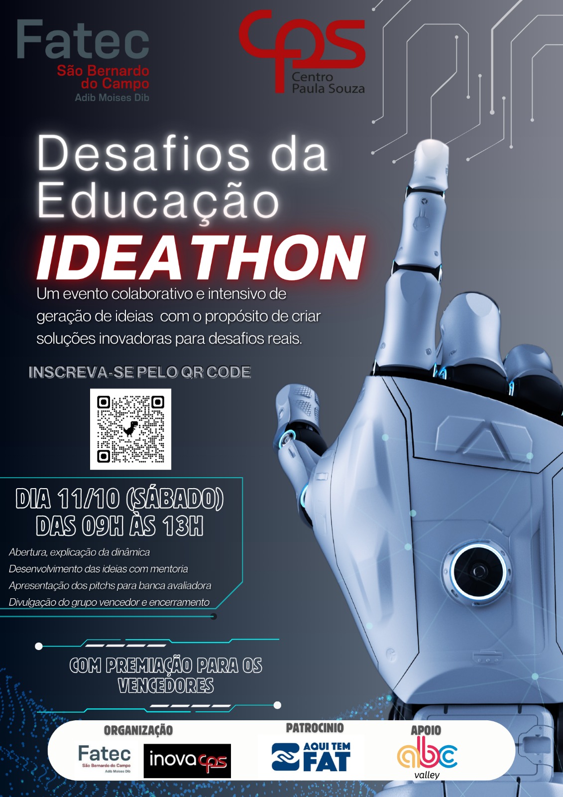 A Fatec Adib Moisés Dib, em São Bernardo do Campo, realiza no próximo sábado, 11 de outubro de 2025, o IDEATHON FATEC SBC 2025 – Desafios da Educação, um evento colaborativo que tem como objetivo estimular a criatividade e o trabalho em equipe na busca por soluções inovadoras para os desafios da educação.