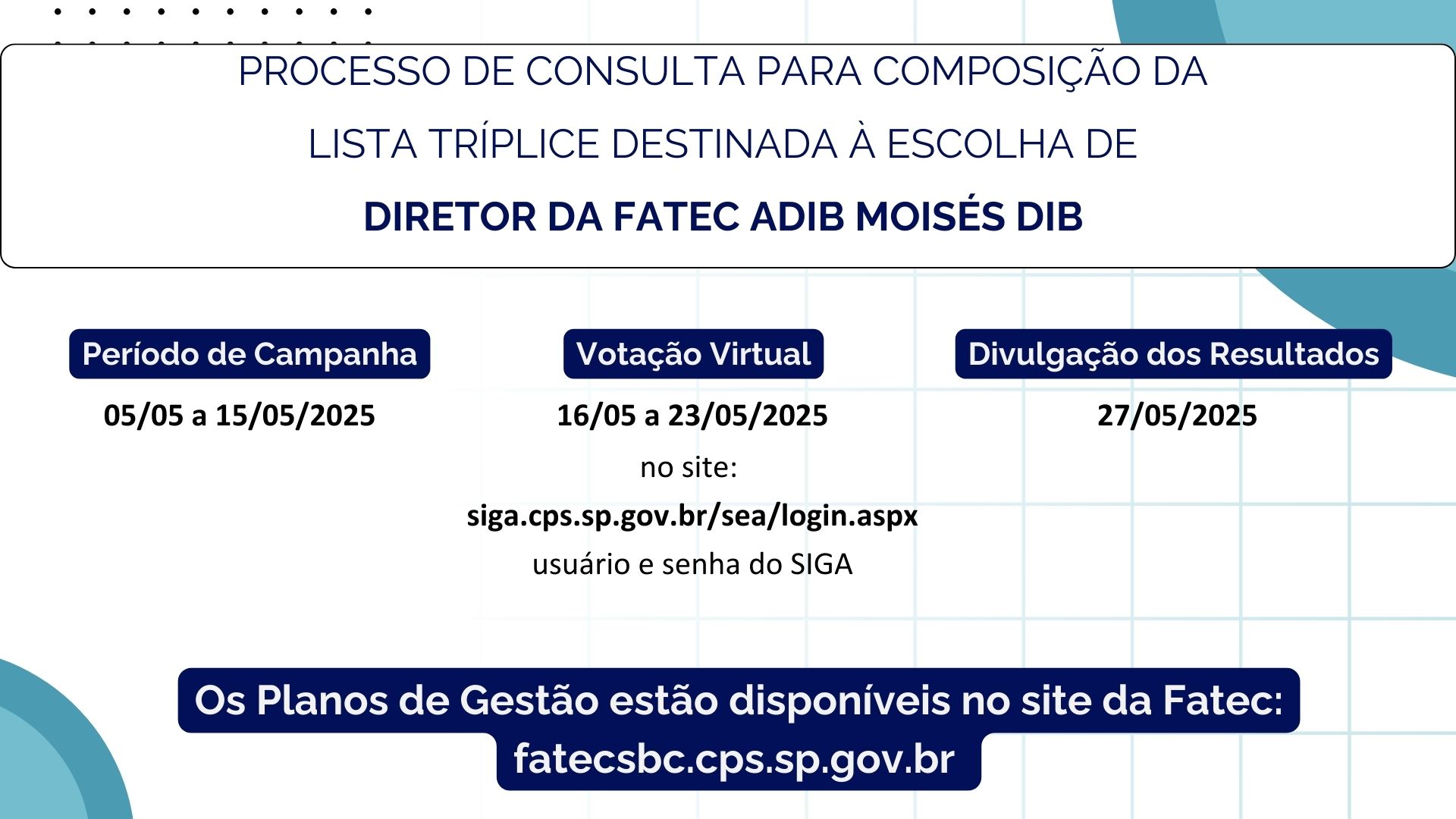 PROCESSO DE CONSULTA PARA COMPOSIÇÃO DA LISTA TRÍPLICE DESTINADA À ESCOLHA DEDIRETOR DA FATEC ADIB MOISÉS DIB